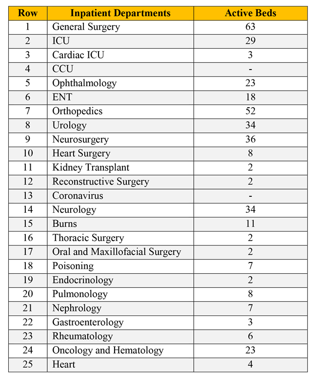 Men’s and Women’s Internal Medicine (Endocrinology, Pulmonology, Nephrology, Gastroenterology, Rheumatology, Oncology, Hematology), Oncology, Neurosurgery, Thoracic Surgery, Maxillofacial Surgery, Plastic Surgery, Vascular Surgery - ICU Heart Surgery